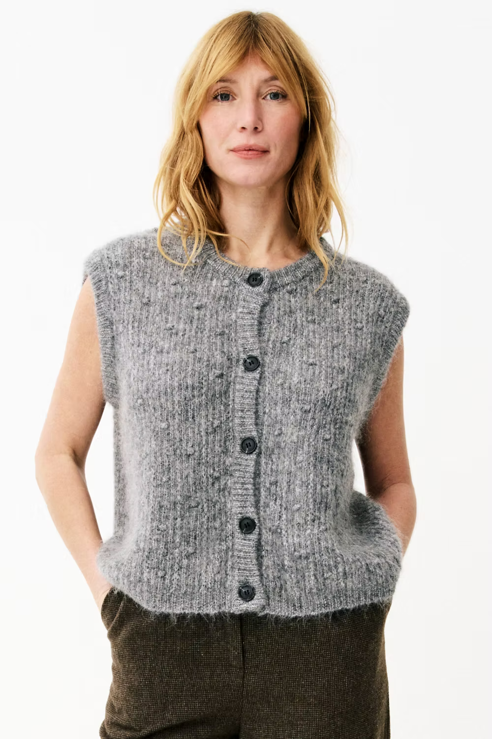 An elevated take on the sleeveless vest, this cardigan-inspired knit strikes the perfect balance between effortless ease and refined style. Subtly textured with modern polka dots, it brings depth and character to layering. Style it solo for understated chic or layer over a crisp white shirt to channel timeless sophistication.